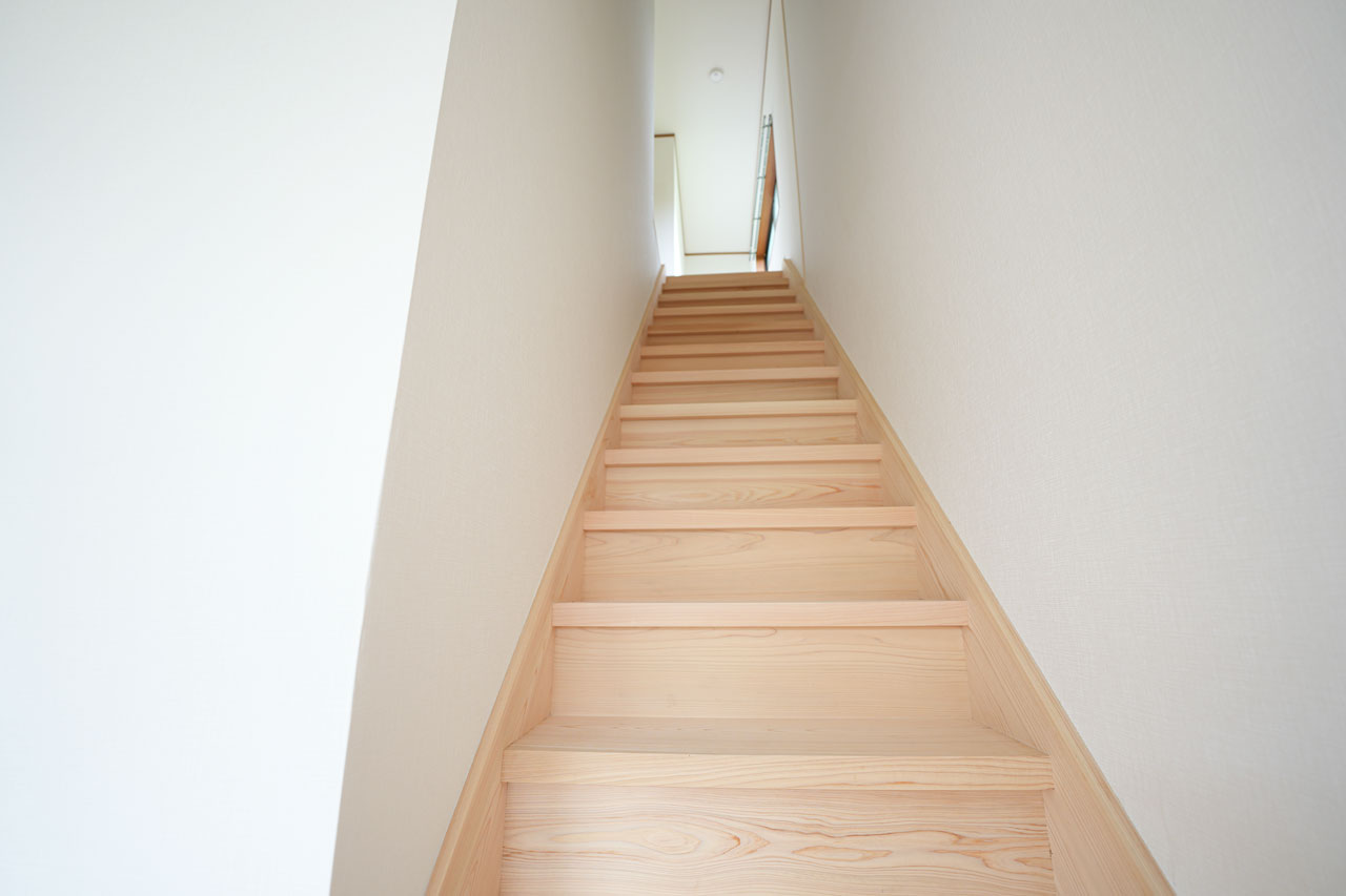 廊下・階段部分も無垢材が使用されています。壁紙はオフホワイトを使用し、明るく温かみのある明るい玄関になっています。