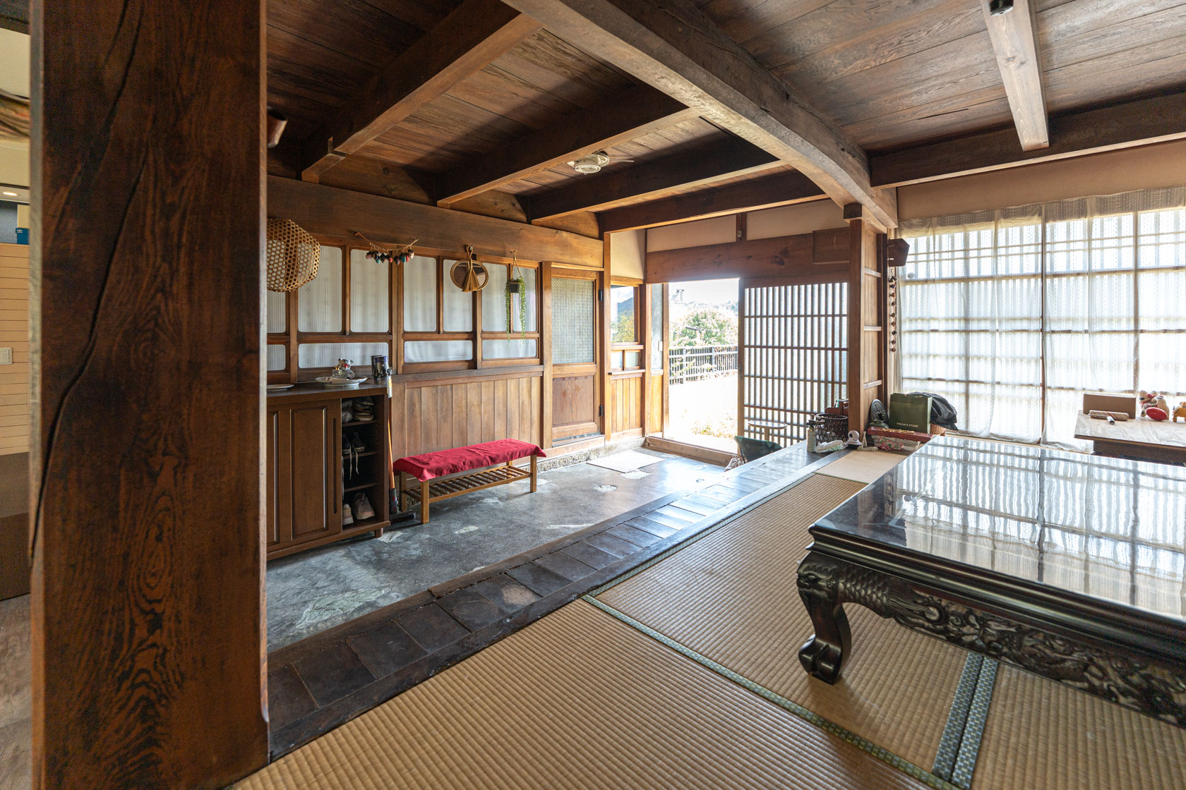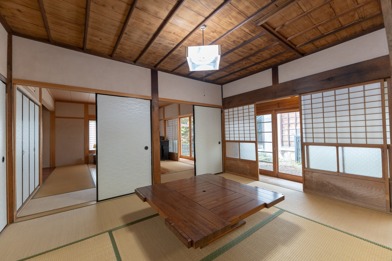 踏み天井と建具、大黒柱。仕切りのない開放的な空間になっており、上がり框からそのまま和室へと上がれます。かつてこの家が酒造として使われていたことを思わせる、商いの面影を感じます。