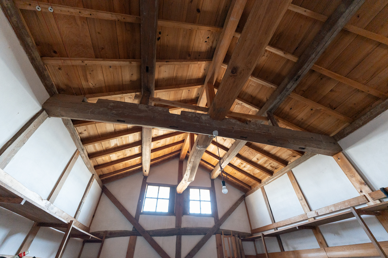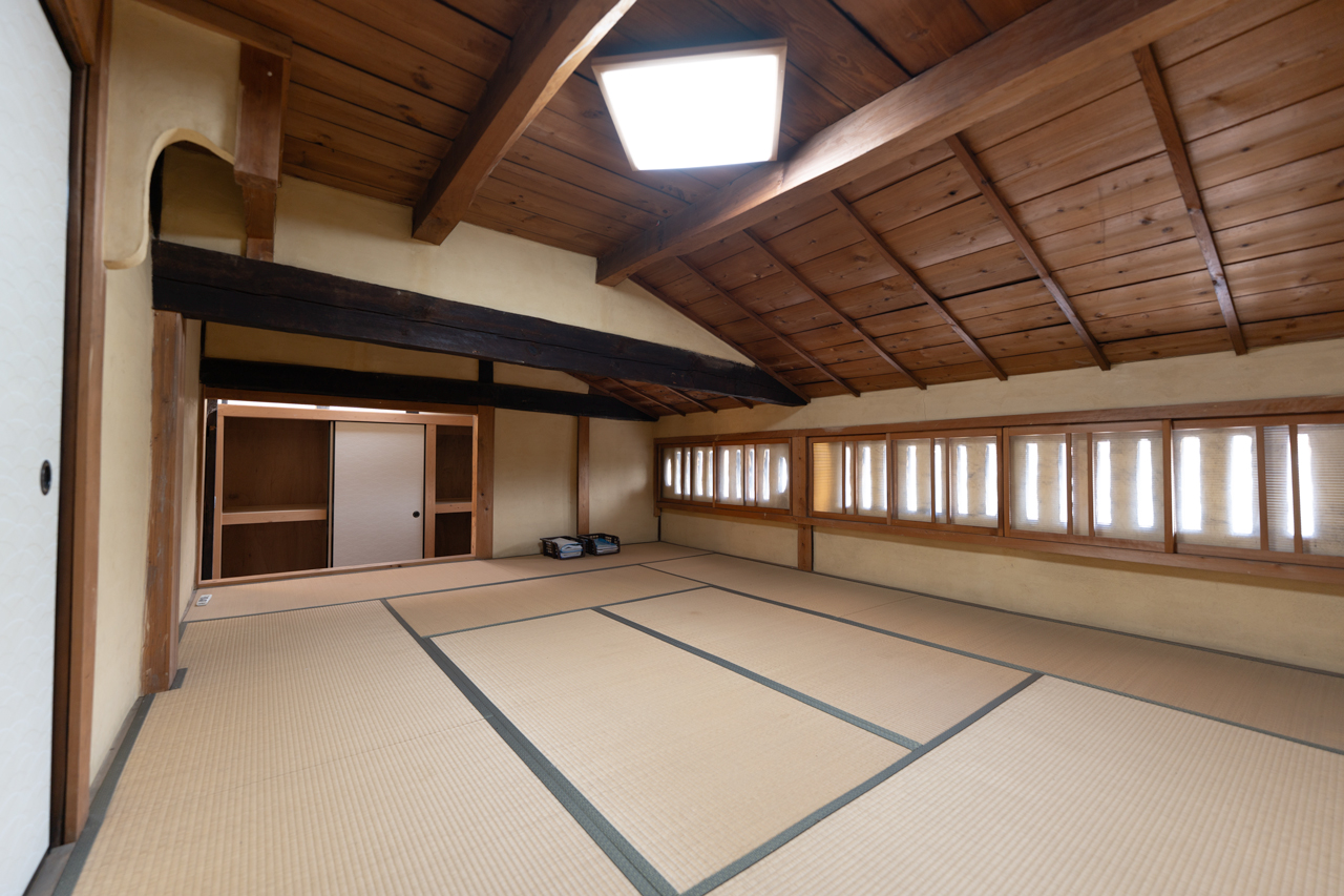 2階へは梯子をのぼって上がることができます。居室や収納スペースとして活用することが可能です。また、虫小窓には建具が取り付けられており、快適に過ごせる工夫がなされています。