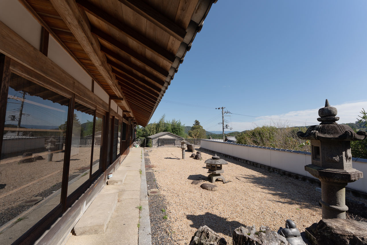お庭は砂利敷きのミニマルな造りで、日本庭園を思わせる静けさがあります。敷地が広いため、菜園や畑づくりは石垣下のスペースを活用し、主庭はシンプルな日本庭園として楽しむのも素敵です。白い塀はリノベーション時に鉄骨で補強されているとの事、この塀だけでもかなりのコストをかけ整えられています。それだけこの白い塀はお家の大切なアクセントになっているように思いました。山並みとのコントラストが非常に美しく、この家ならではの景観をつくり出しています。