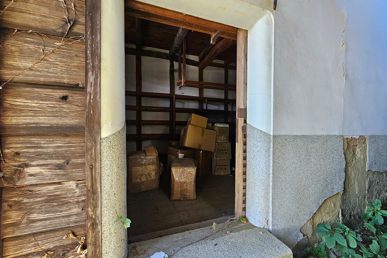 蔵は二階建てで収納力も十分。母屋の二階から蔵へ直接出入りできる造りで、アウトドア用品などの保管に重宝します。蔵にも階段がついています。一階部分は石垣下の庭からも出入りでき、草刈り機やガーデニング用品の収納にも便利です。