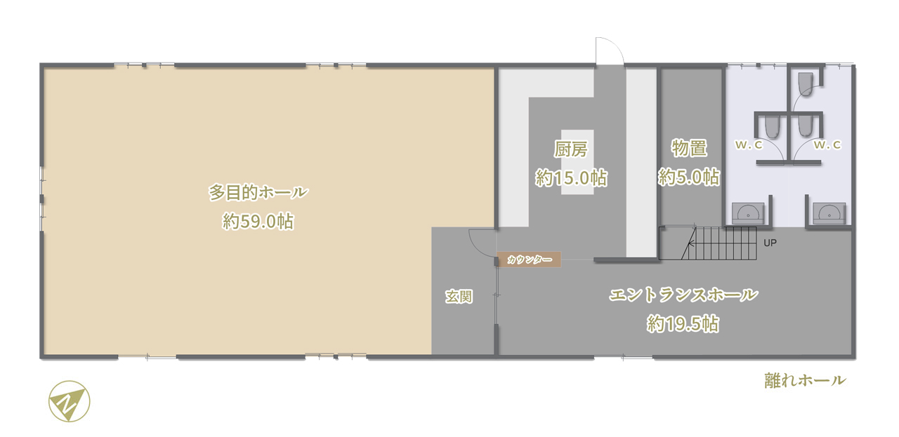 居室エリアの裏手にある別棟の離れは酒造場を利用した大きなホールとドイツ製の高級キッチンメーカーで用意された本格的な仕様のキッチンエリアがあります。ビジネスでも利用されていた経緯がありこのような仕様になっています。例えば母屋は居室として利用し、酒造場のホールは保養を兼ねてのお仕事のミーティングスペースとしてご利用する事も可能です。その際に本格的なキッチンでお食事を造る事も可能です。トイレもオフィス・店舗仕様で多人数でも困らないように造られています。母屋と酒造場ホールの間には蒸留として利用されていたと思われる池があります。こちらには現在鯉が2匹住んでいます。様々な利用の仕方が考えられるエリアです。