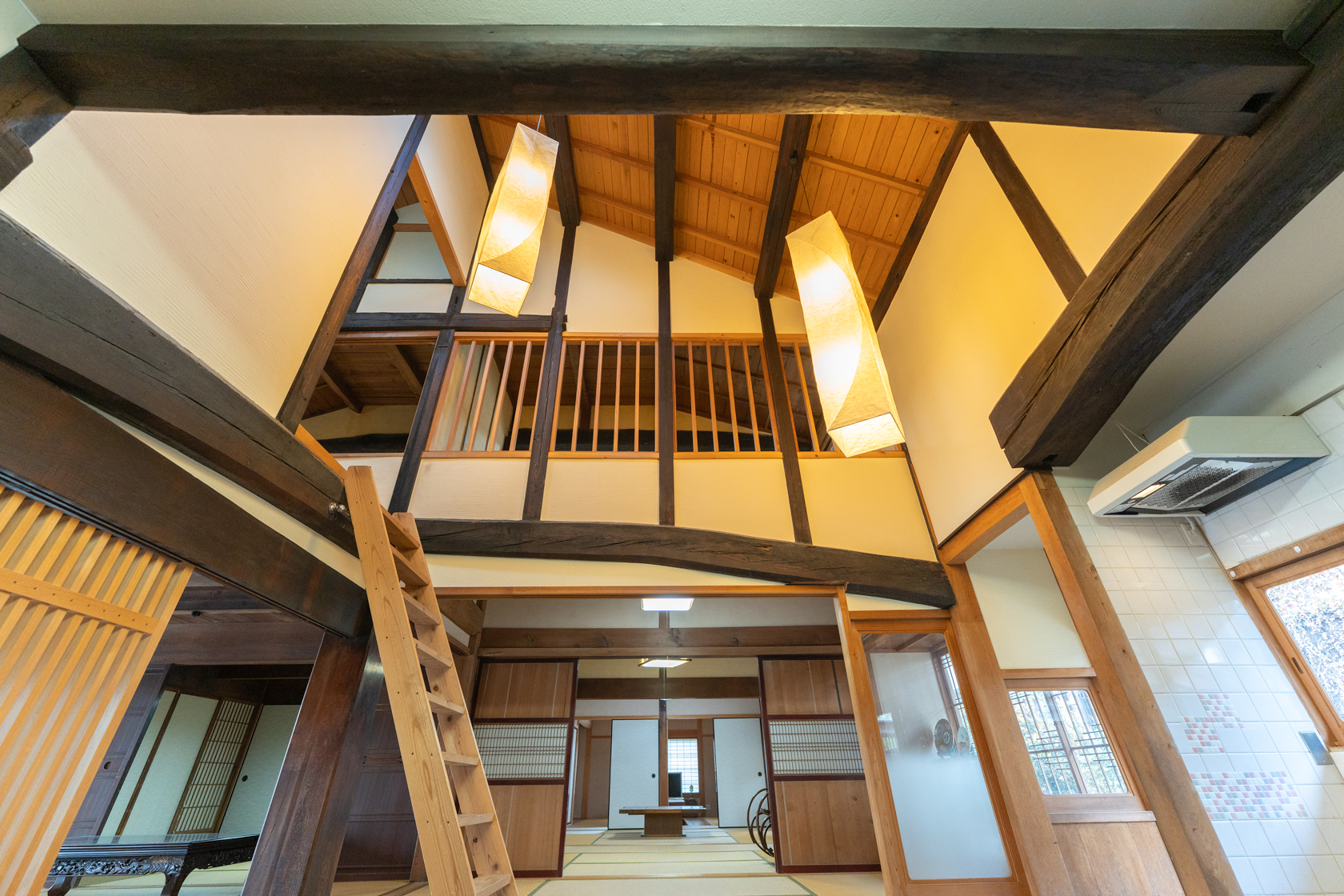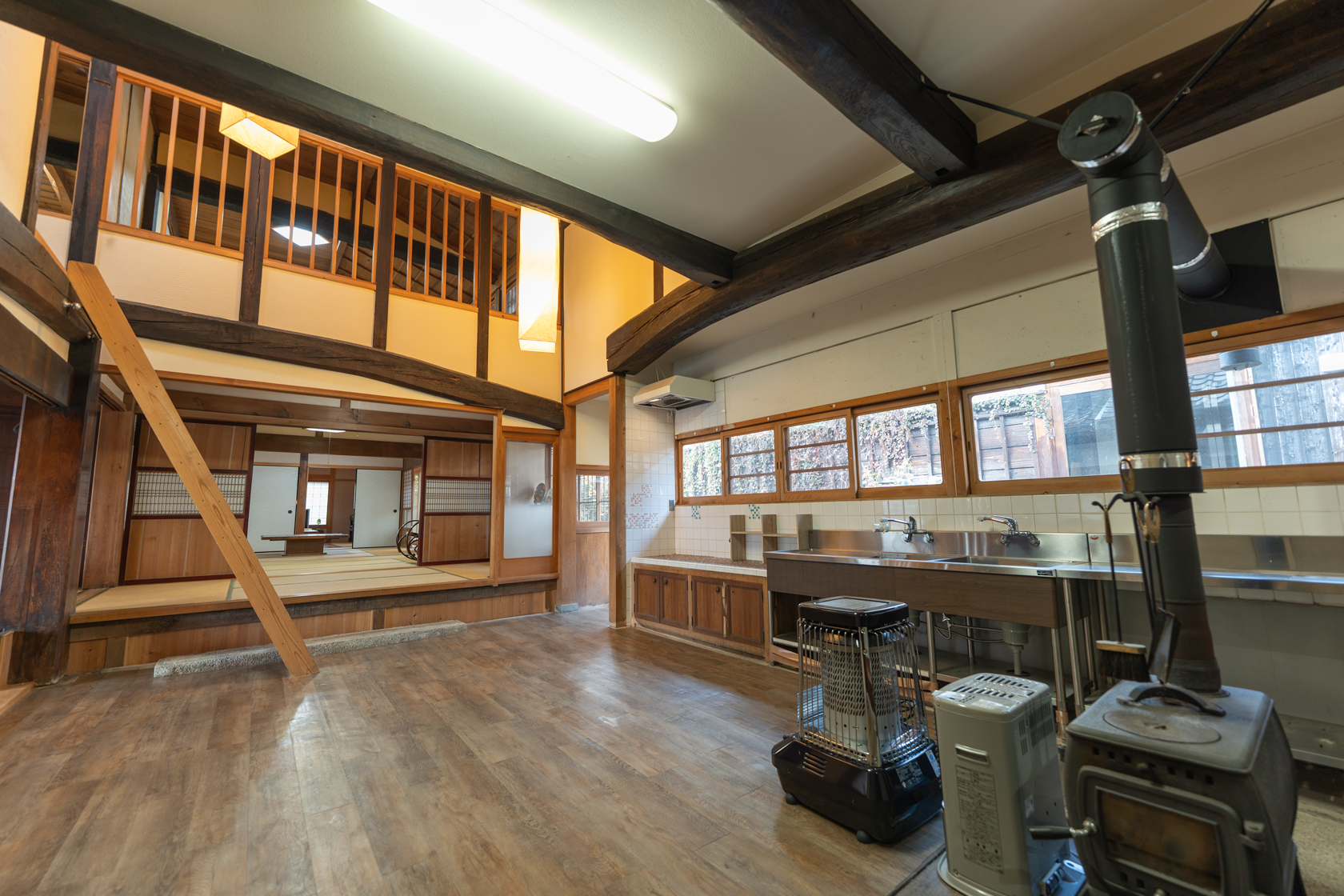 吹き抜け天井に、ステンレス製のキッチンとタイル張りの調理台。木の戸棚や太い梁、トップライトから射し込む光。古民家リノベーションではご要望の多い薪ストーブも設置されており、冬でも芯から温まる時間を過ごすことができます。古民家リノベーションの魅力を凝縮したような空間です。