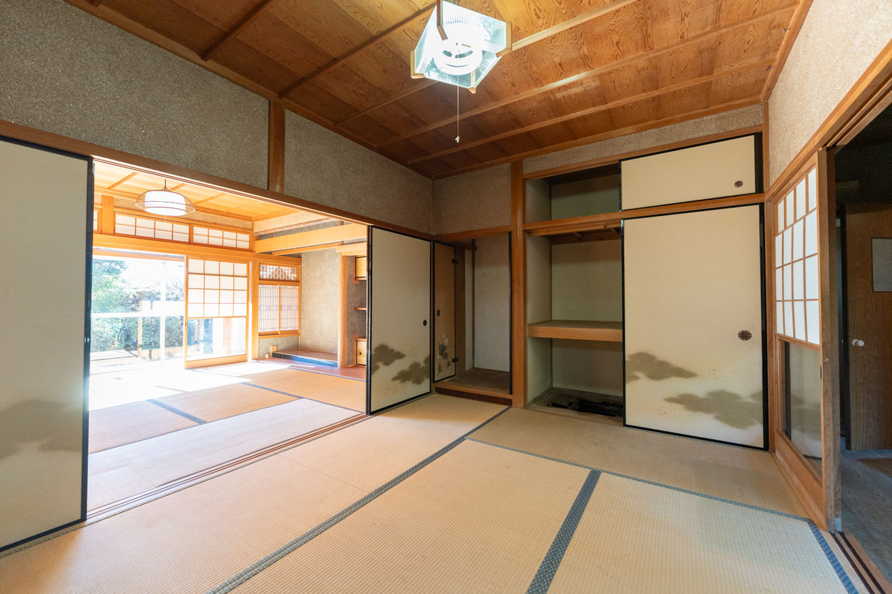 母屋エリアは、昭和の趣を残す日本家屋。玄関は玉石を用いた洗い出し仕上げが可愛らしいです。田の字型の和室に縁側を備えた、伝統的な和の間取り。縁側は南、北どちらにもあり、南側の縁側からは庭の植栽を眺めながらゆったりと過ごすことができます。室内は老朽化している部分ありますがきれいな状態です。床の間も立派で、日本家屋ならではの落ち着きを感じられる空間。