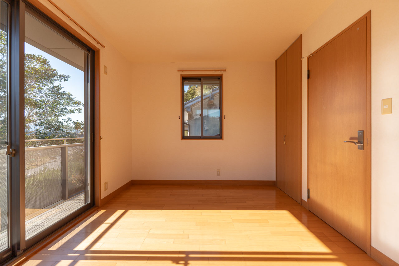 2階は約9帖の広々とした板間があります。こちらは物置としても活用できます。お部屋は洋室2室と和室2室があります。和室は特に南向きで日当たりの良いお部屋です。