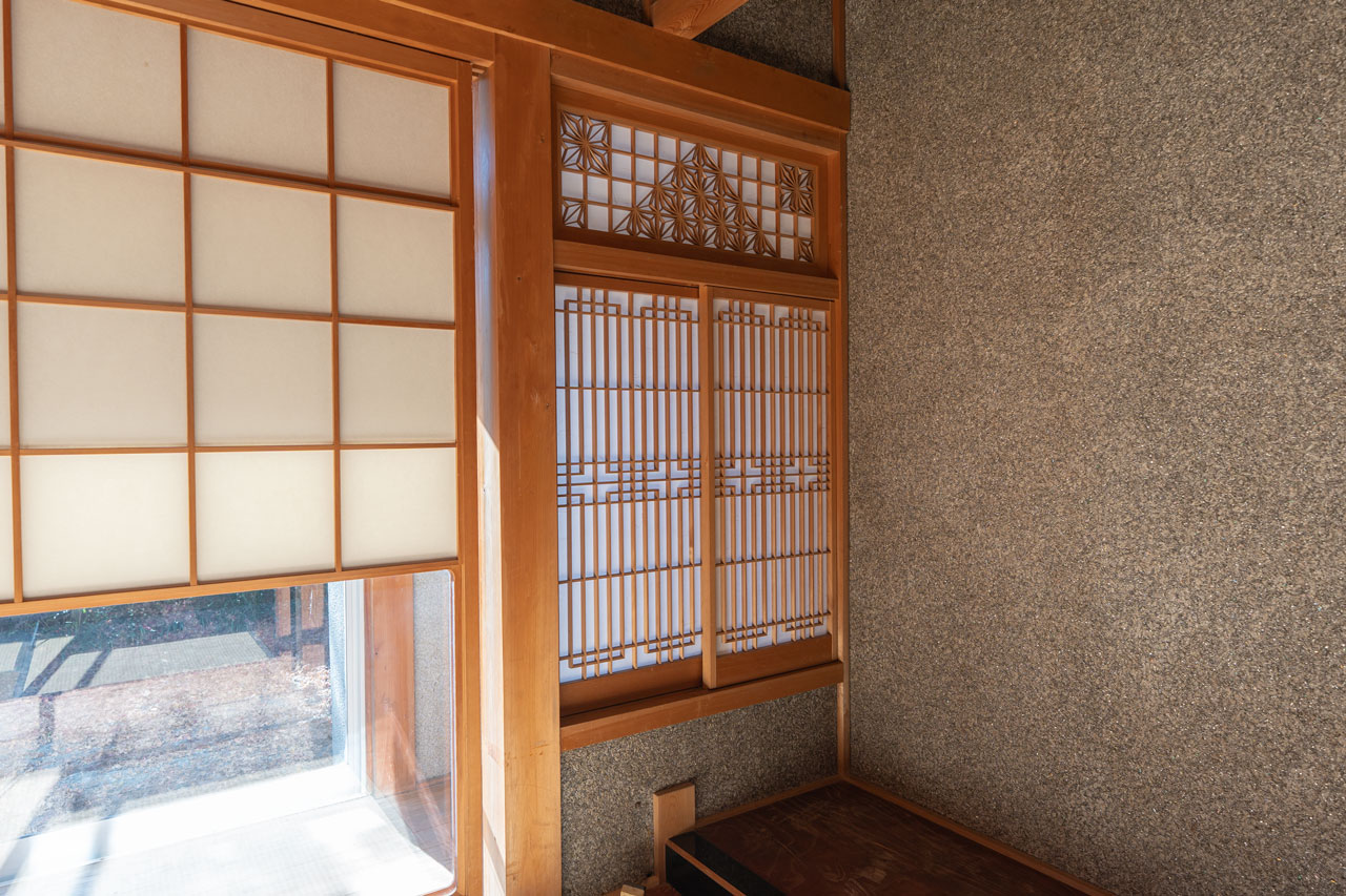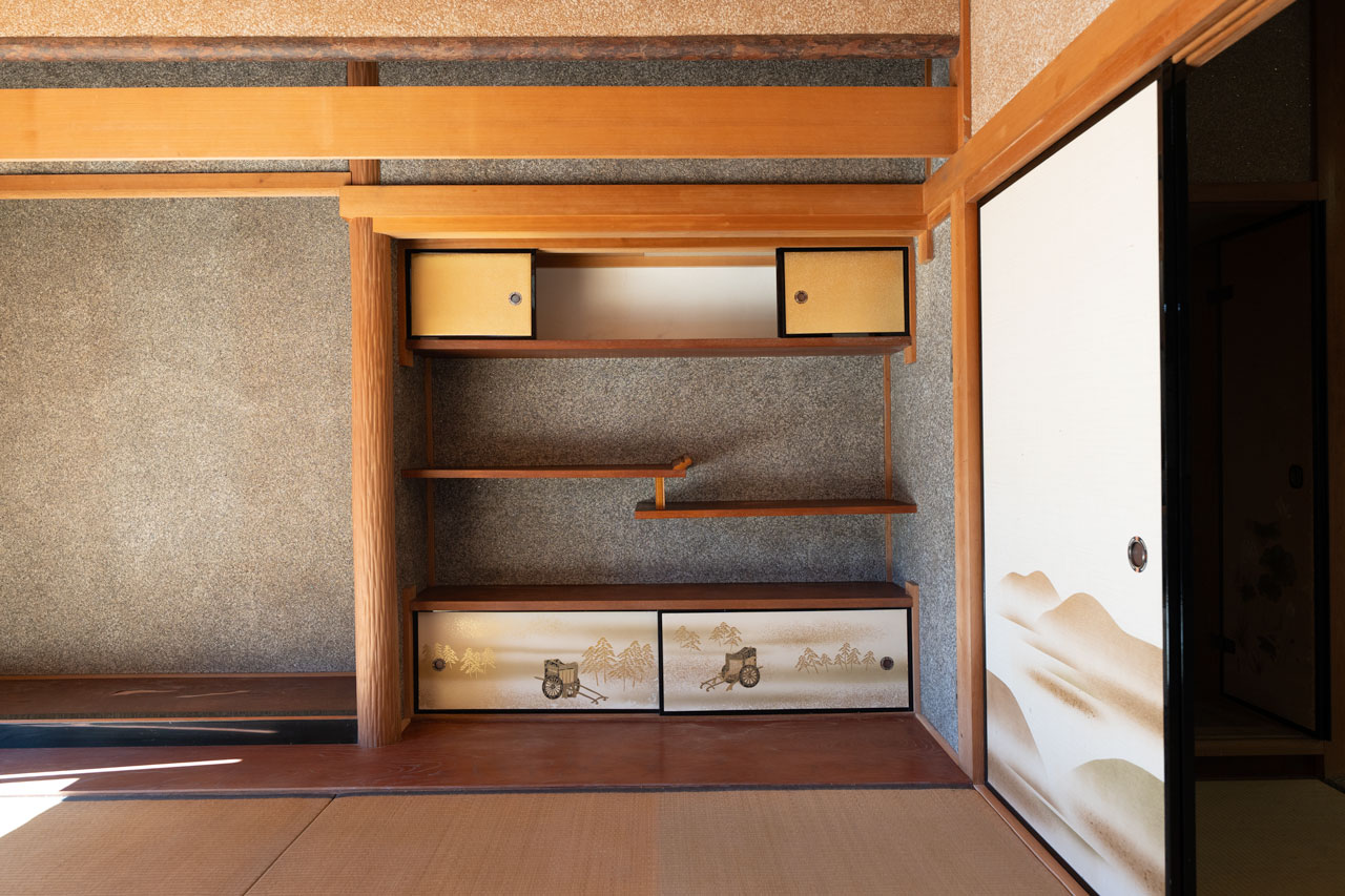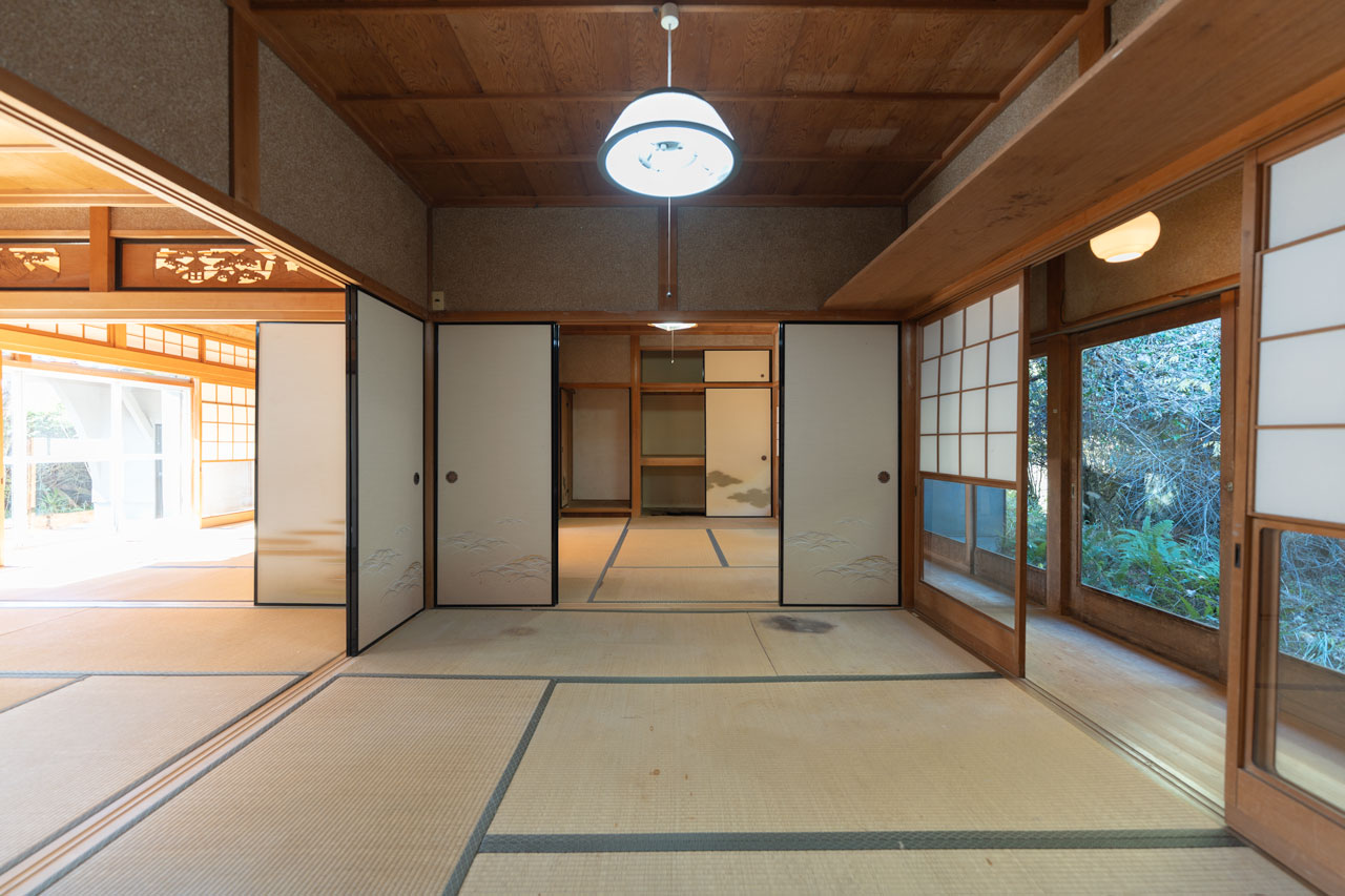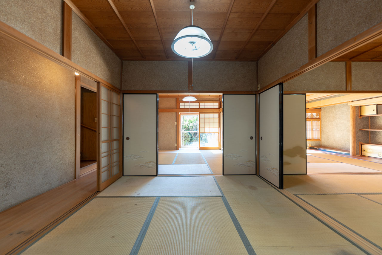 母屋エリアは、昭和の趣を残す日本家屋。玄関は玉石を用いた洗い出し仕上げが可愛らしいです。田の字型の和室に縁側を備えた、伝統的な和の間取り。縁側は南、北どちらにもあり、南側の縁側からは庭の植栽を眺めながらゆったりと過ごすことができます。室内は老朽化している部分ありますがきれいな状態です。床の間も立派で、日本家屋ならではの落ち着きを感じられる空間。