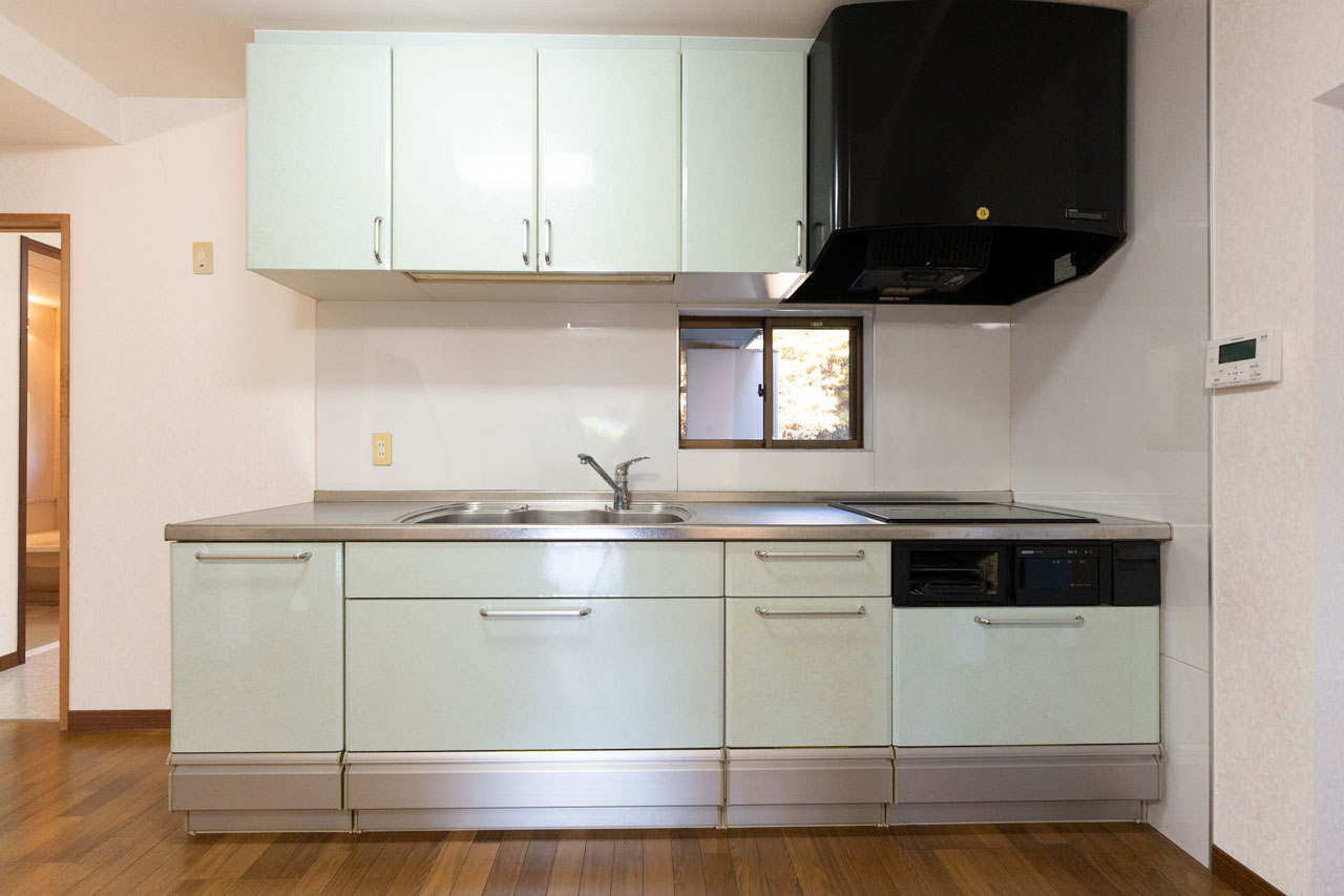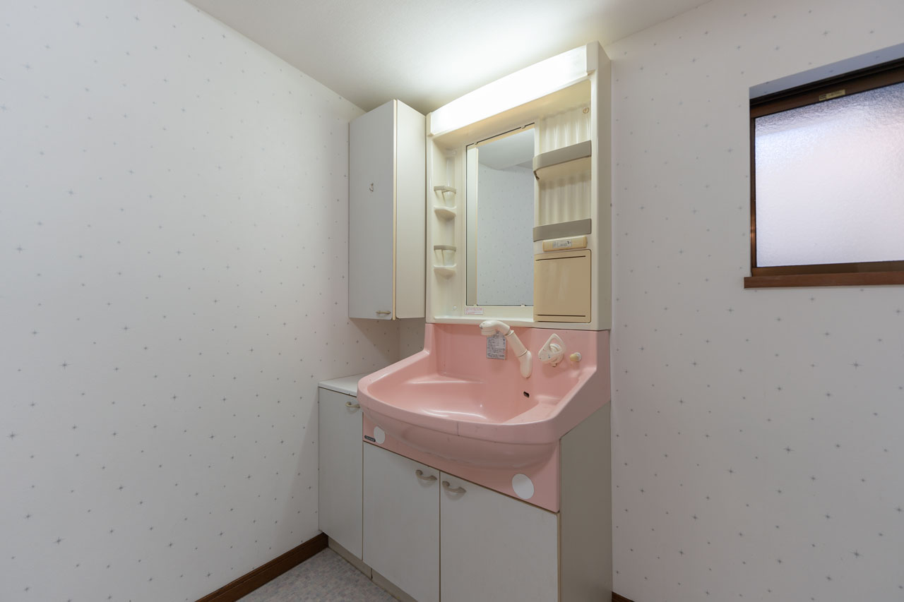 キッチンは増築時にリフォームされているようで、オール電化仕様。大型の食器棚も設置されており、多人数での生活にも十分対応できる広さと収納力があります。洗面室は約3.7帖と、一般的な洗面室よりもゆとりのある広さ。お風呂はシステムバスが採用されてます。