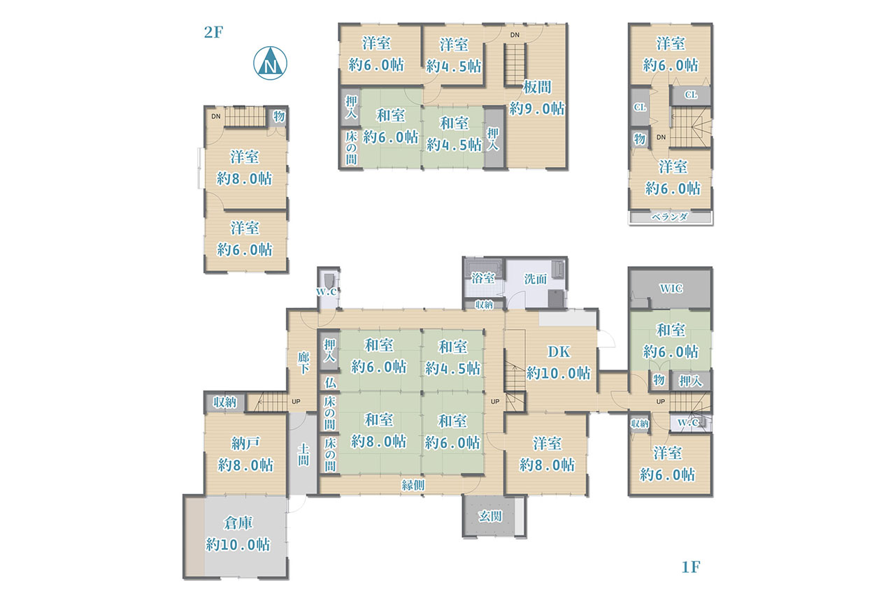 家屋は、昭和の風情ある佇まいが残る母屋と、平成3年にハウスメーカーで建てられた住宅を増築した構成となっており、居宅内でそれぞれがつながっています。水回りを共有する設計で、間取りは16DK+倉庫・納戸という、ゆとりあるビッグハウスです。建物は大きく分けて母屋エリア・増築エリア・倉庫エリアの3つのゾーンで構成されています。母屋エリアは、純和風の趣を感じる縁側付きの田の字型和室が並ぶ、落ち着いた空間。2階には広めの板間があり、物置や多目的スペースとしてご利用いただけます。増築エリアは、使用感があまり感じられない比較的きれいな状態で、平成3年の増築時にオール電化住宅として整備されています。キッチン・洗面所・浴室は母屋と共有ですが、トイレは別に設けられており、生活動線にも配慮された造りです。倉庫エリアは、納戸を含めると約18帖の広さがあり、農作業用の道具やアウトドアギアの収納に最適。倉庫エリアの2階には洋室が2室あり、1階土間から直接出入りも可能です。これだけの間取りがあるため、ご家族構成に合わせた柔軟なルームプランニングが可能です。また、居住しながらのゲストハウス運営や二世帯的な使い分けもしやすく、各エリアが明確に分かれている点もポイントです。国道沿いという立地に加え、広い畑が付属していること、複数台駐車が可能な点も含め、さまざまな用途が考えられる居宅です。